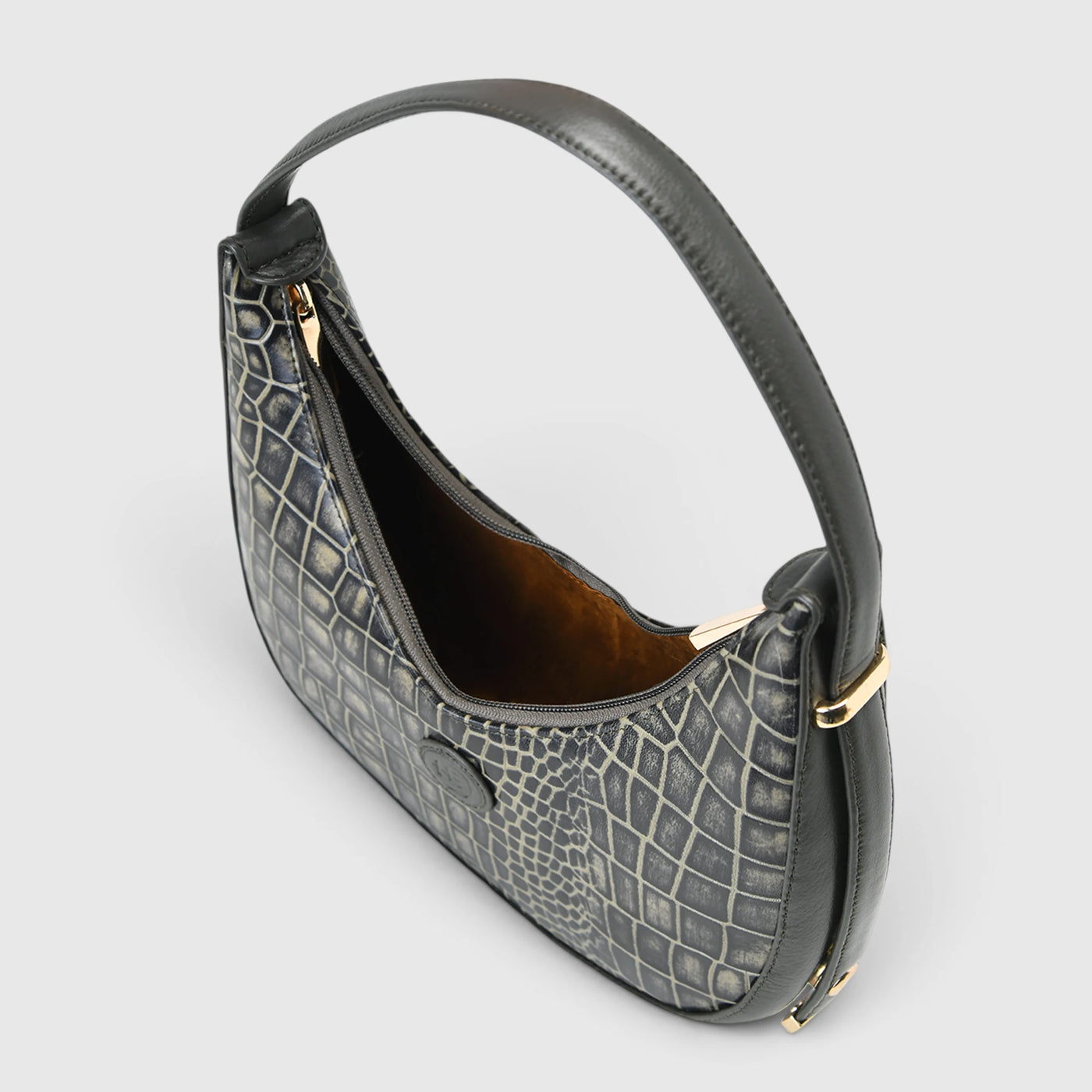 Bold, sculpted, and unapologetically stylish — the Noir Croco Vintage Crescent Shoulder Bag brings together heritage texture and modern silhouette. Designed in a crescent or “hobo” profile, this piece is crafted from premium croc-textured leather with a distressed black-gold finish, giving it a dramatic, luxurious character.