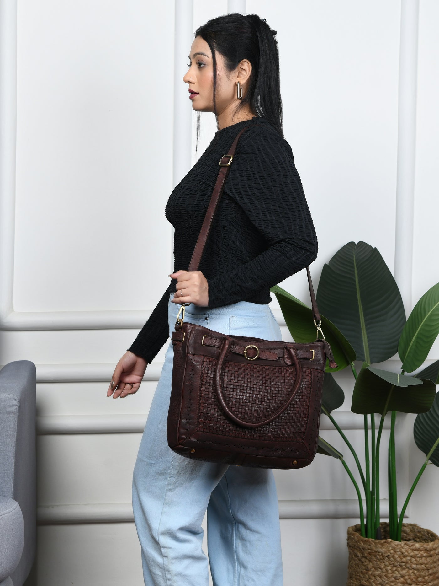 Vintage Woven Espresso Leather Women's Handbag - Brown Colour